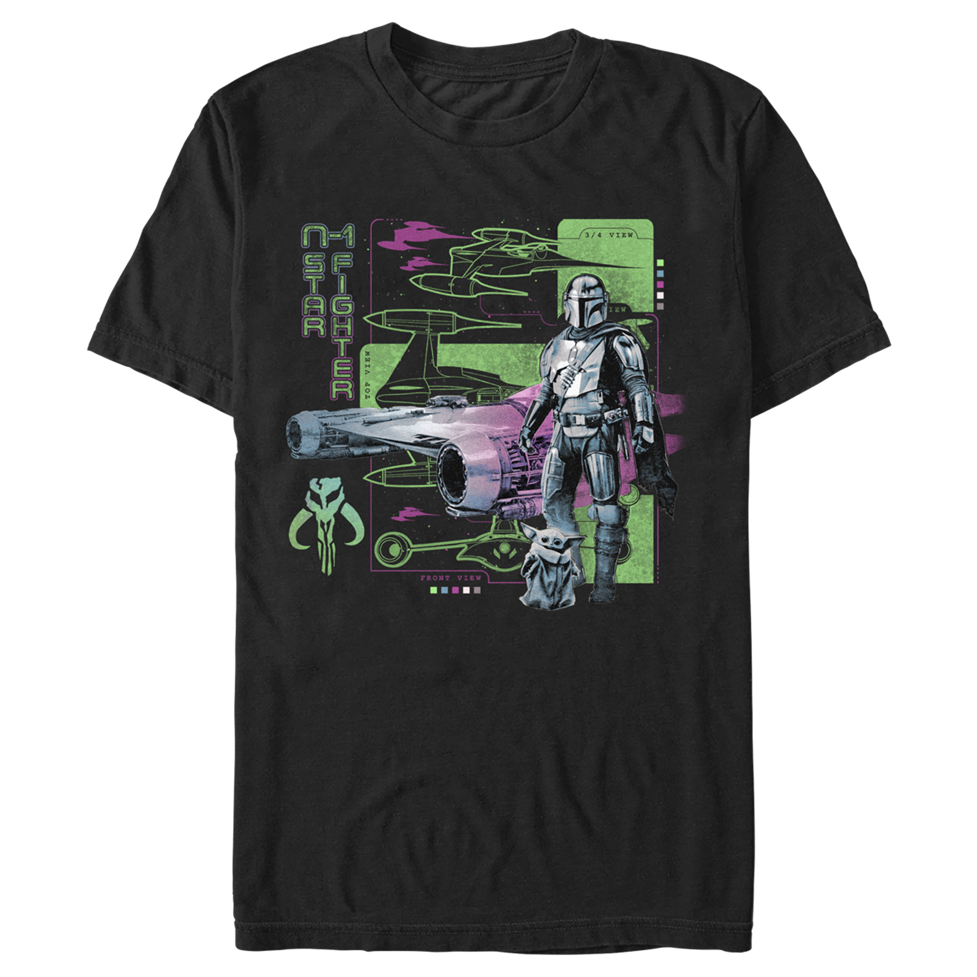 This graphic tee showcases a detailed illustration of the iconic N-1 Starfighter from The Mandalorian, piloted by Din Djarin (Mando) and accompanied by Grogu. The design is reminiscent of classic movie posters, featuring bold, eye-catching graphics. The advanced Kornit printing technique highlights the sleek lines and intricate details of the starfighter.