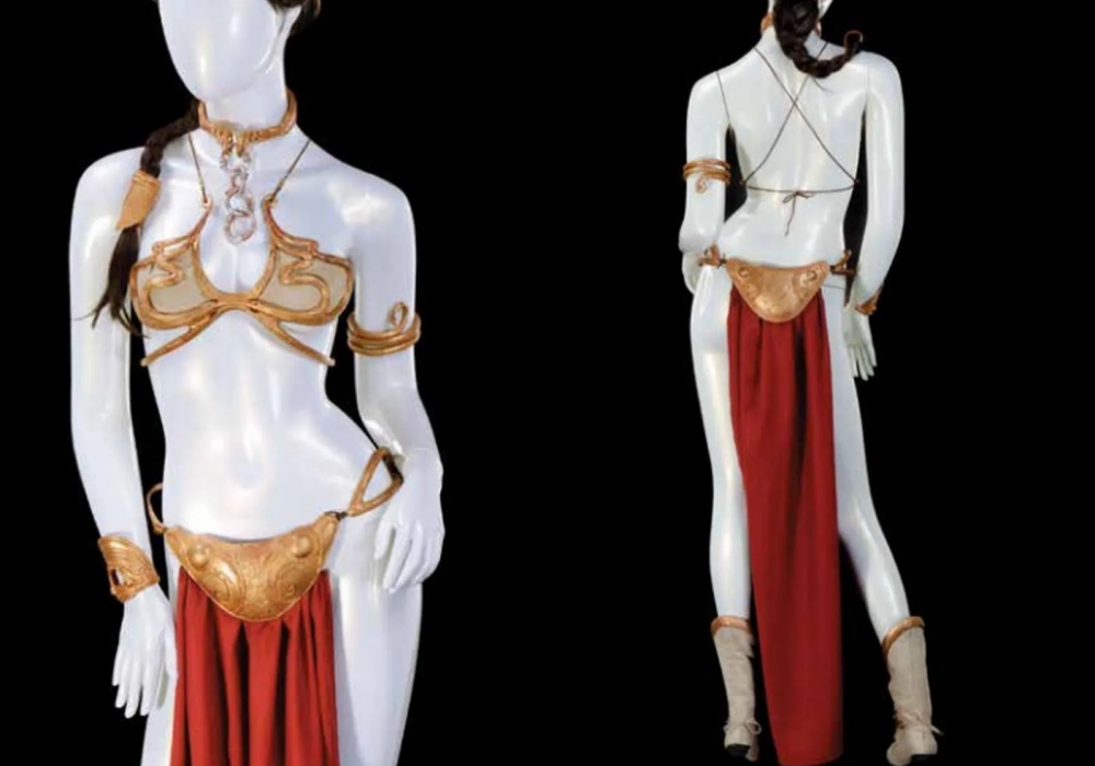 Princess Leia’s slave costume originally came from Richard Miller, a longtime designer at Industrial Light and Magic who sculpted and designed this unforgettable outfit. The costume included the original rubber elements worn on screen, along with fabric parts recreated from photos to stay true to the original look. Worn by Carrie Fisher in Return of the Jedi, the gold bikini became an iconic piece when Leia was captured and chained by Jabba the Hutt. Since then, both the scene and the costume have been recreated countless times in shows and as a popular Halloween outfit.