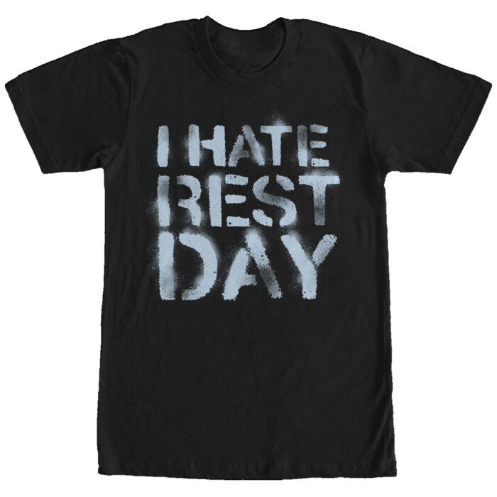 If you hate rest days more than Mondays, then the Chin Up Rest Day Black T-Shirt is the perfect tank for you! This durable graphic tee has �I hate rest day� printed across the front in a unique, spray-painted style.