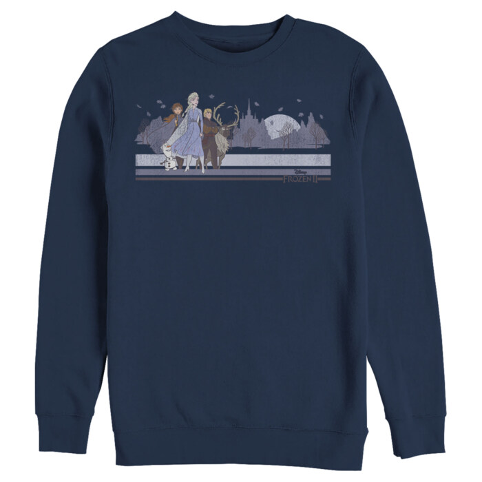 Travel across the enchanted lands into the unknown with this Disney Frozen 2 Winter Travelers Men's Sweatshirt! Elsa, Anna, Kristoff, Olaf, and Sven are featured with Arendelle in the distance during their journey north on this adorable design with fun retro stripes.