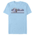Travel across the enchanted lands into the unknown with this Disney Frozen 2 Winter Travelers Men's T-Shirt! Elsa, Anna, Kristoff, Olaf, and Sven are featured with Arendelle in the distance during their journey north on this adorable design with fun retro stripes.