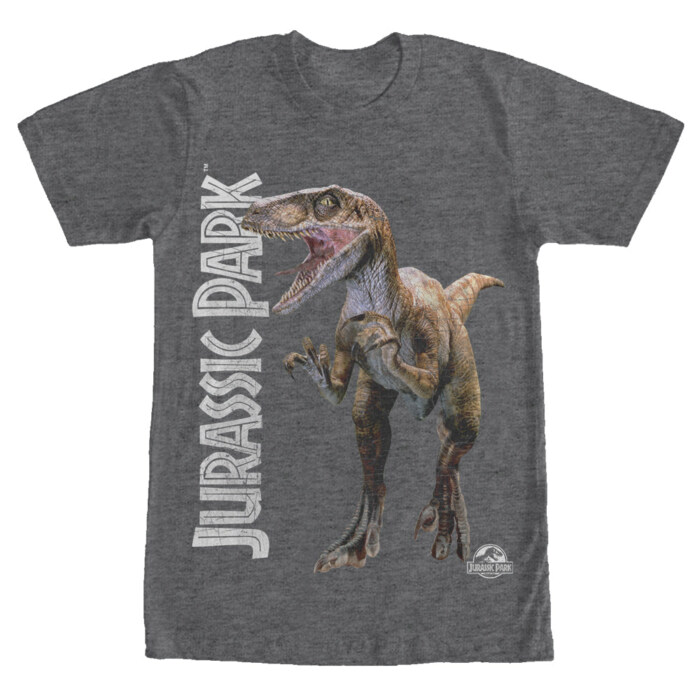 The Jurassic Park Velociraptor Logo Heather Charcoal T-Shirt is being hunted by dinosaur fans! A lightly distressed Jurassic Park logo is printed next to a fierce velociraptor on the front of this awesome gray Jurassic Park t-shirt.