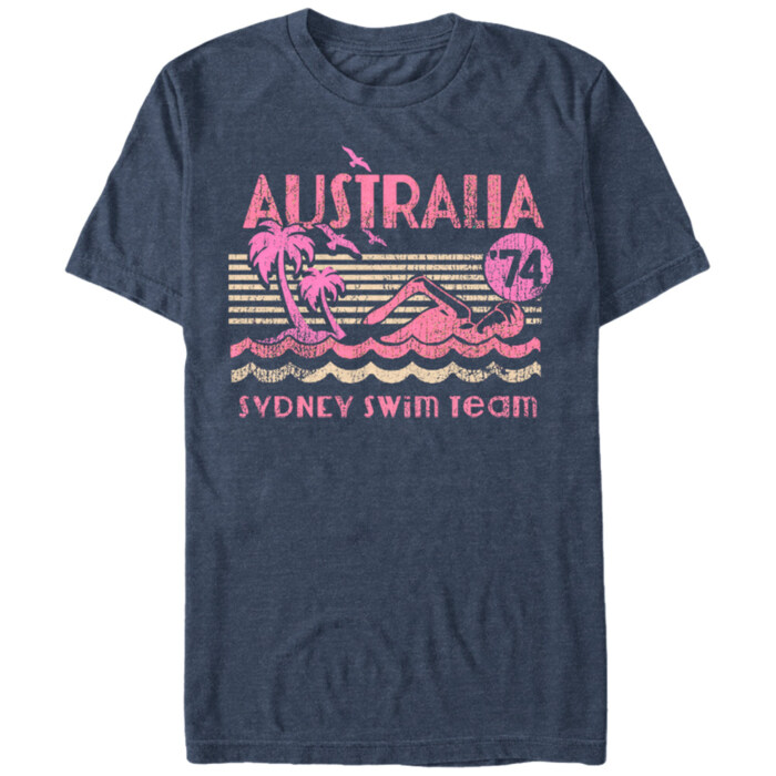 If you love the land "Down Under" then head down under the waves with the Lost Gods Australia Swim Team Heather Navy Blue T-Shirt to show your love for all things Australian! The distressed print "Australia '74 Sydney Swim Team" is featured alongside a graphic of palm trees, birds, a swimmer, and the ocean waves on this cool blue Australia shirt.