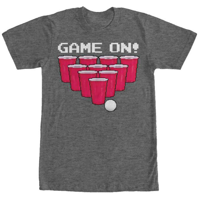 Grab your buddies and a stack of red cups, it's time for the Lost Gods Game On Beer Pong Heather Charcoal T-Shirt! Pixelated red cups and a beer pong ball are printed under "Game On" on the front of this awesome gray beer pong shirt.