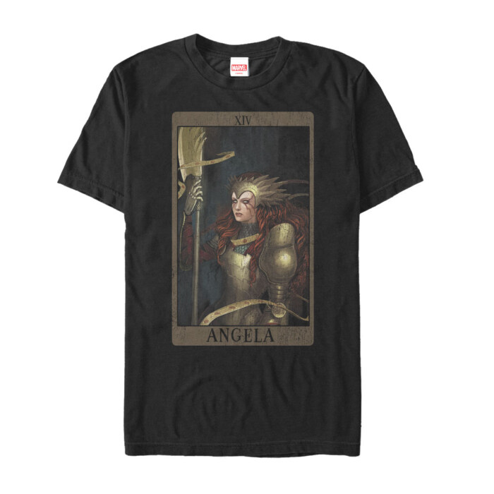Calling all Marvel Huntress fans! Unleash your inner superhero with our Marvel Angela Card Black T-Shirt. This is no ordinary T-shirt; it's a powerful statement of your fandom, featuring Angela, the fearless Asgardian Huntress, in splendid detail.