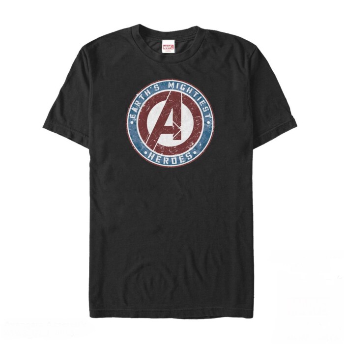 Score top marks in style and superhero coolness with our Marvel Avengers Earth's Mightiest Heroes Black T-Shirt. This is not just a shirt, but a heroic declaration, featuring the powerful Avengers logo enveloped by "Earth's Mightiest Heroes" in vintage, patriotic colors for that superior comic appeal.