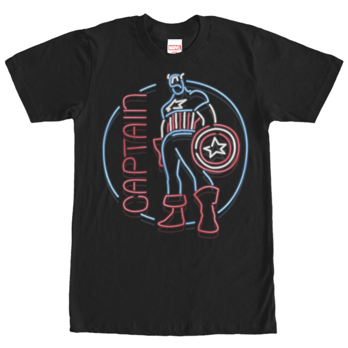 Step into the glow of a superhero realm with our Marvel Captain America Neon Sign Print Black T-Shirt. This unique tee is more than just a piece of clothing; it's an exciting adventure illuminated with neon charm, featuring the legendary Captain America standing tall and brave against the darkness.