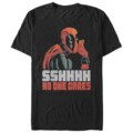 Embrace your edgy comic book love with our Marvel Deadpool No One Cares Men's T-shirt. Let everyone know who your favorite antihero is, featuring a bold yet distressed cartoon Deadpool and a cheeky message saying, "Sshhhh No One Cares," assuring your playful personality shines through.