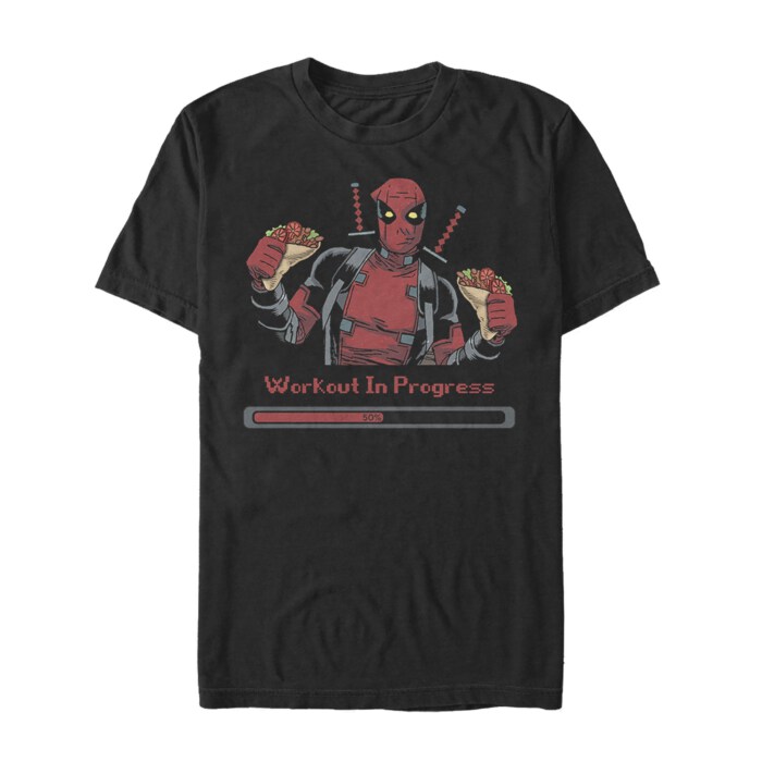 Imagine sporting this shirt, with the twin tacos in Deadpool’s grip bringing a silent chuckle to your lips. Deadpool's casual, nonchalant strength is perfectly captured as he's featured holding his favorite post-workout snack, refuting all hallmarks of conventional fitness routines. The bold text 'Workout in Progress' in vibrant red announces your ongoing fun journey to keep fit.