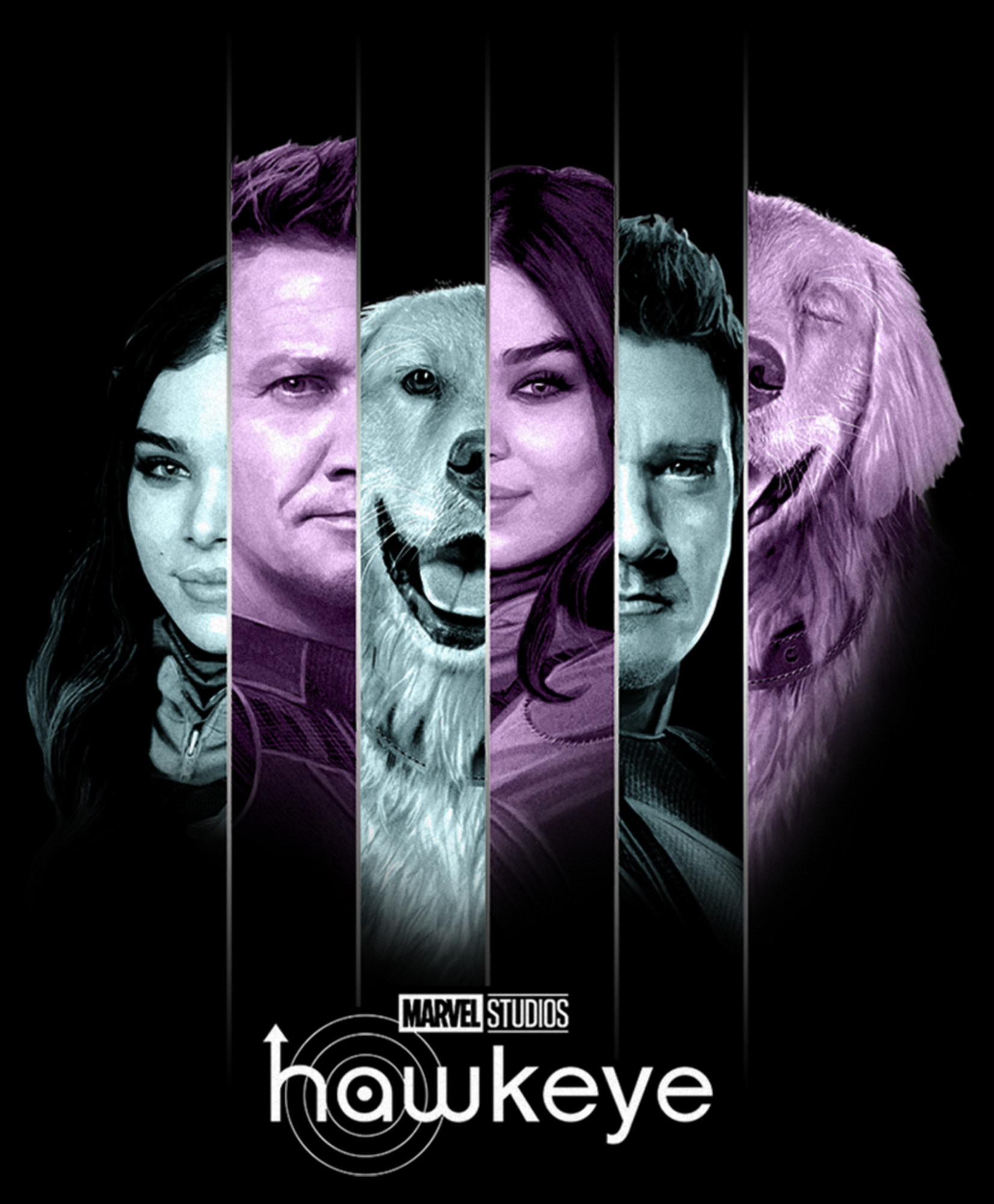 Men's Marvel Hawkeye Kate Bishop and Lucky the Pizza Dog Split Panels Adult T-Shirt