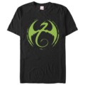 Embrace the spirit of heroism and the mystic arts with our Marvel Iron Fist Dragon Logo Black T-Shirt. Behold the striking dragon tattoo emblem, imprinted directly from Daniel Rand's battle conquest over Shou-Lao, illuminating in an expressive shade of green on the midnight black canvas of the shirt.