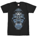 Imagine walking through Comic-Con, catching admiring glances from fellow Marvel enthusiasts. The futuristic Iron Man, captured in a stylized blue and white graphic, dominates the shirt, demonstrating Stark's ceaseless quest for innovation and improvement. This design, offset against the stark black of the shirt, offers a bold and modern visual statement.
