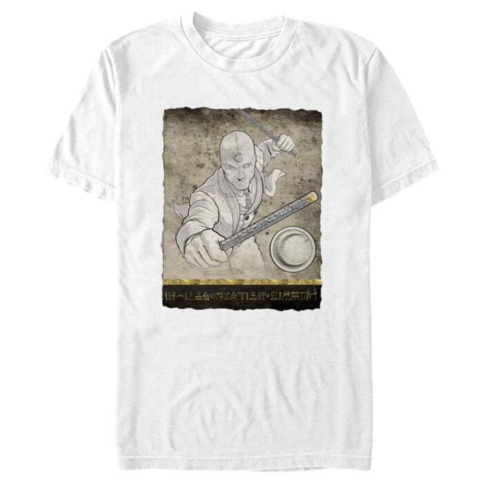 Join the heroic ranks of Marvel fans wearing this Moon Knight Mr. Knight Action Pose Men's Tee. Embodying more than just a garment, this T-shirt is your ticket to an action-packed adventure and the mighty power of the Egyptian god, Khonshu, as it prominently features Mr. Knight posed for action on a spectacular scroll fragment.