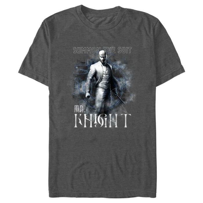 Unleash the power of your wardrobe with our Marvel Moon Knight Mr. Knight Summon the Suit Men's Tee. This is not just a tee, it's your own personal superhero suit, officially licensed by Marvel and draped with the legendary Moon Knight, Mr. Knight, in a commanding pose, ready for action.