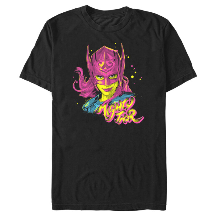 Imagine striding through the cinematic universe, your Thor T-shirt radiating with colors of a distant galaxy. Jane Foster, sporting the iconic winged helmet, beams from the front, imbuing courage and resilience in all who dare to glance. Below her, 'Mighty Thor' marks the attire, pumping an extra dose of heroic strength into your day.