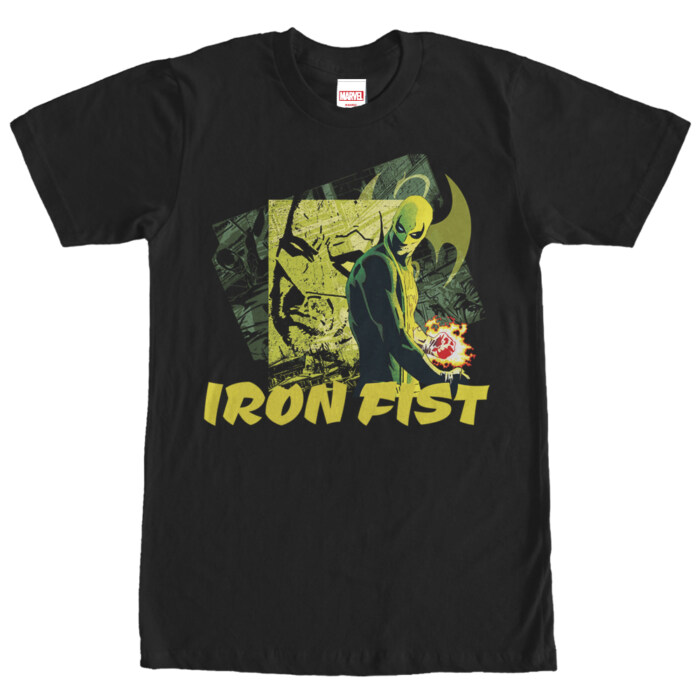 Spark up and experience the rush of supernatural energy as you don this shirt building a vivid connection with your favorite Marvel hero. Our hero, Iron Fist, is decked out with his symbolic glowing fist at the helm, demanding justice and revenge in bright, bold prints that dramatically stand out against the cool black backdrop.