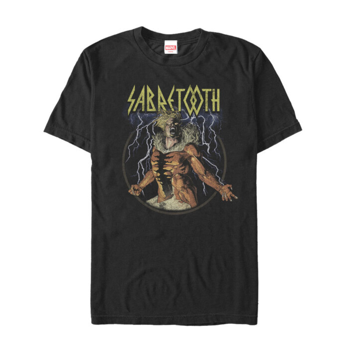 Picture yourself reveling in a comic convention, your Sabretooth t-shirt making a roaring statement amongst fellow Marvel enthusiasts. The imposing Sabretooth, framed by striking lightning bolts, unleashes his raw power across the shirt. His name sears across the screen, adding a striking touch to this bold ensemble.