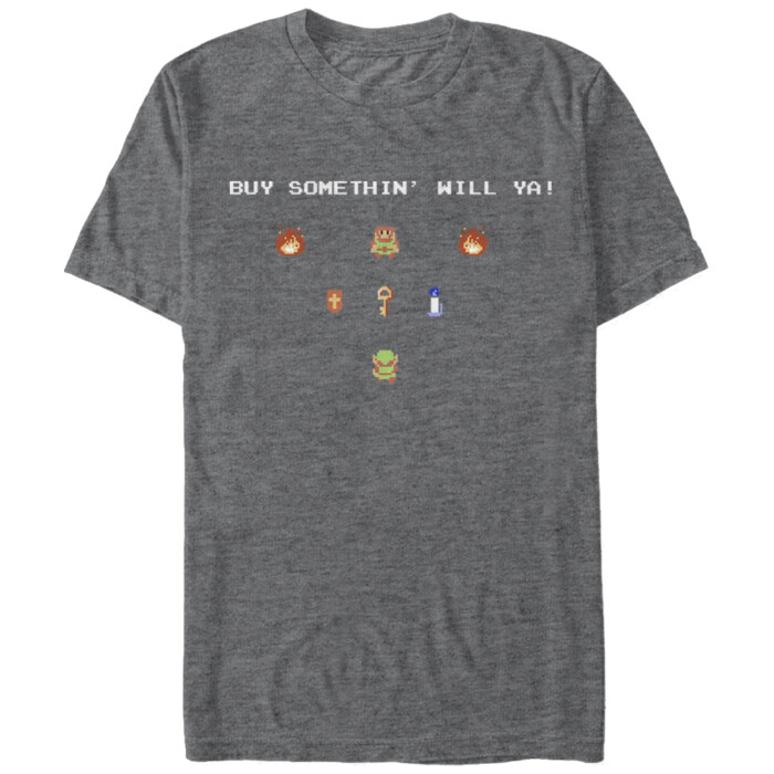 If you have enough Rupees then head to one of the merchant's stores for a Magical Shield on the Nintendo Legend of Zelda Merchant Buy Something Heather Charcoal T-Shirt. A pixelated Link considers buying a Blue Candle, a Magical Shield, or a Key while an impatient merchant demands "Buy Somethin' Will Ya!" on this gray Link shirt.