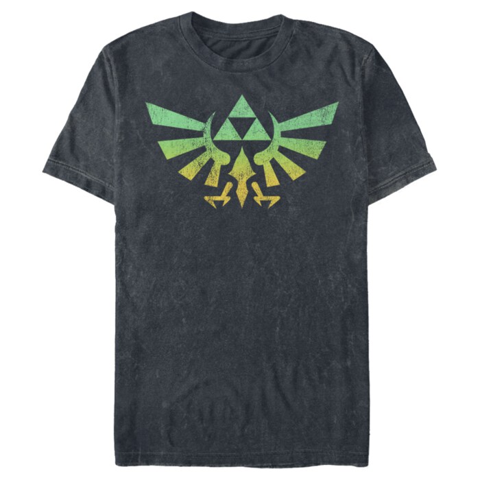Join Princess Zelda and Link on their next quest with the Nintendo Legend of Zelda Natural Triforce Men's Tee. The Triforce of power from Hyrule is printed in a lightly distressed style that fades from yellow to green on the front of this fun Legend of Zelda tee.