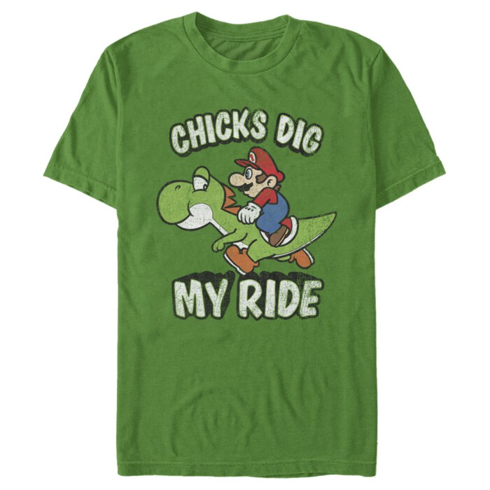 Yoshi will steal your heart on the Nintendo Mario Chicks Dig Ride Men's Tee. Mario is shown riding Yoshi across this Mario tee with "Chicks Dig My Ride" in distressed green print.