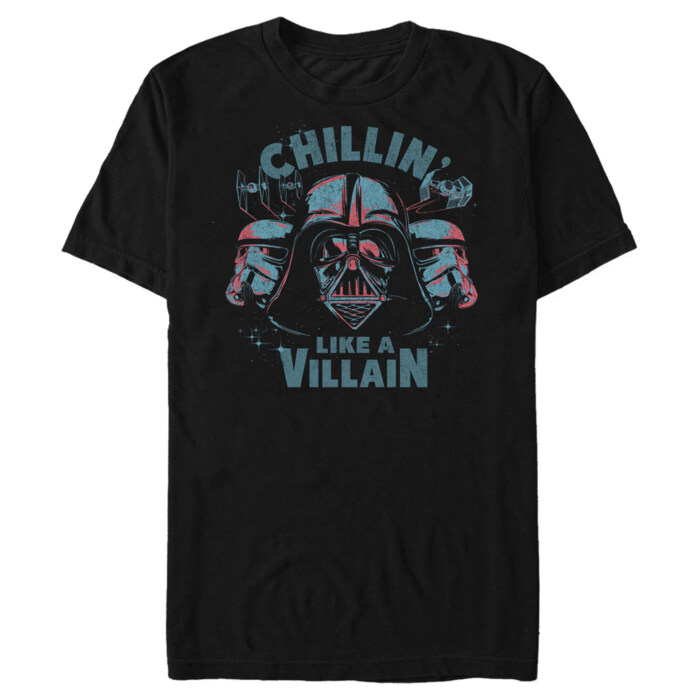 No need to keep looking for fashion help in Alderaan places! Add a little out-of-this-world style into your wardrobe with some truly epic Star Wars tees! Transport yourself to a galaxy far, far away with this new Star Wars Darth Vader Chillin' Like a Villain Men's black T-Shirt featuring a red and blue colored Darth Vader and two Stormtrooper heads with the phrase: "Chillin' Like a Villain," in big bold lettering.