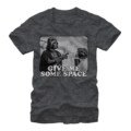 It would not be wise to disobey Lord Vader! "Give me some space" is printed next to a black and white image of Darth Vader threatening Princess Leia on the front of the Star Wars Give Vader Some Space Heather Charcoal T-Shirt.