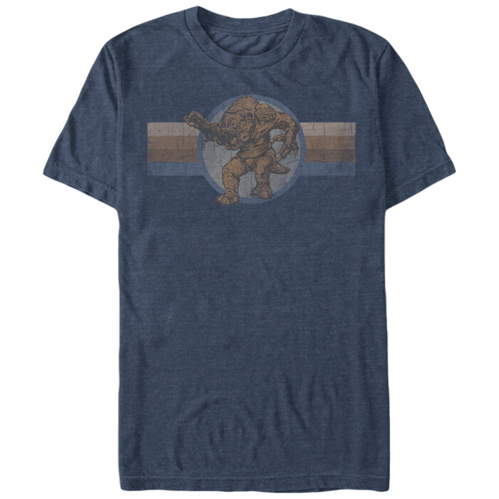 Next time you head to Tatooine, bring home the Star Wars Retro Rancor Heather Navy Blue T-Shirt! A distressed vintage-style print features the fearsome rancor owned by Jabba the Hutt printed on the front of this cool navy blue rancor T-shirt.