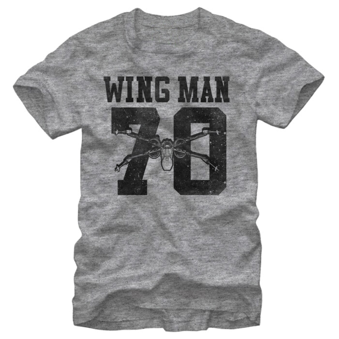 Join the likes of Luke Skywalker and Poe Dameron when you rock the Star Wars X-Wing Man Heather Gray T-Shirt. This durable gray Star Wars shirt reads "Wing Man" above the number 70 and an X-Wing fighter, all in a slightly distressed vintage-style black print.