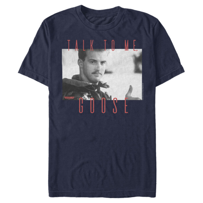 Do you have what it takes to claim the Top Gun Trophy? Then suit up and get ready to join the most elite Navy pilots around like Maverick and Iceman with this officially licensed Top Gun Talk to Me Goose Movie Scene Men's Tee! Dress in style and rep your favorite aviator movie with this design that features a snapshot of Nick "Goose" Bradshaw giving a thumbs up!