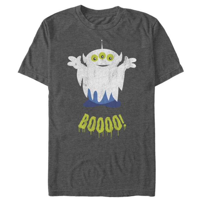 The Little Green Men are all dressed up for Halloween in this adorable Men's Tee, from Pixar's Toy Story, featuring one of the aliens dressed as a ghost with "Boooo!" in dripping green letters underneath.