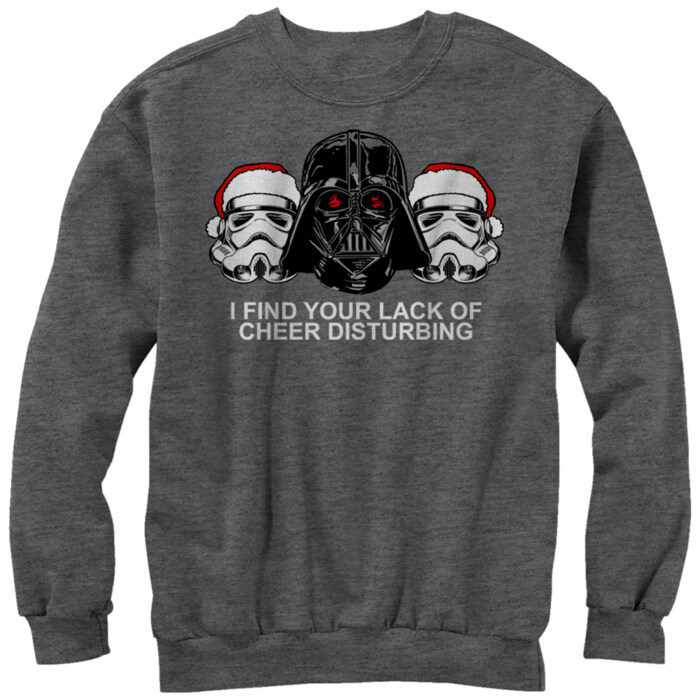 That's not Santa you hear in the sky, it's a TIE fighter carrying the Star Wars Christmas Empire Lack of Cheer Heather Charcoal Oversized Sweatshirt! Darth Vader's helmet sits next to two stormtrooper helmets with Santa hats and the phrase "I Find Your Lack of Cheer Disturbing" printed on the front of this funny oversized gray boyfriend-cut Star Wars Christmas sweatshirt.
